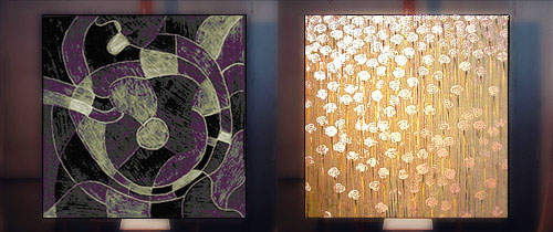 Декоративные панно для лестничного пролета (размер 100 х 100 х 5 см). Панно выполнены на объемных подрамниках и отступают от поверхности стены на ощутимую высоту, при этом торец панно является продолжением росписи.