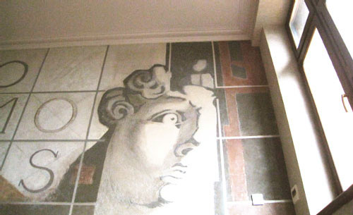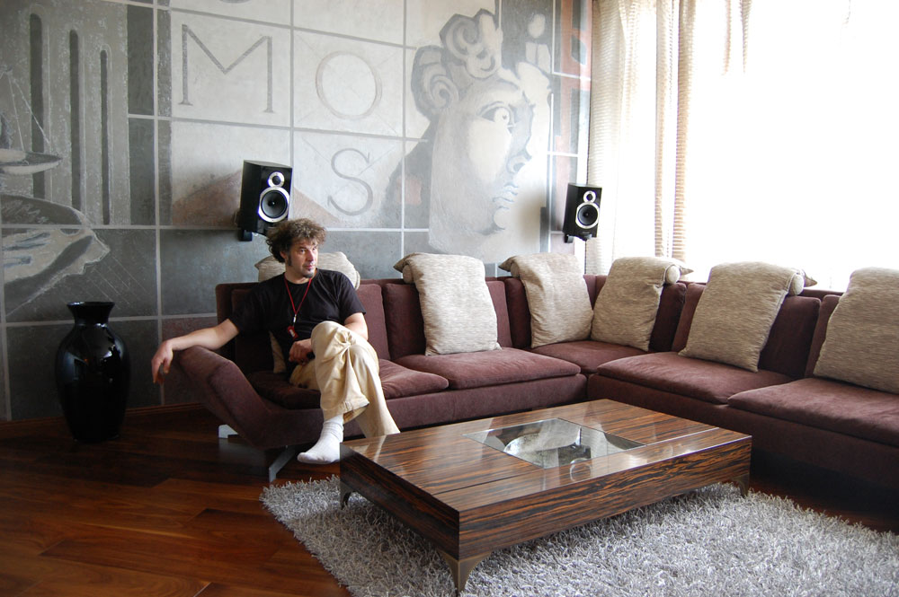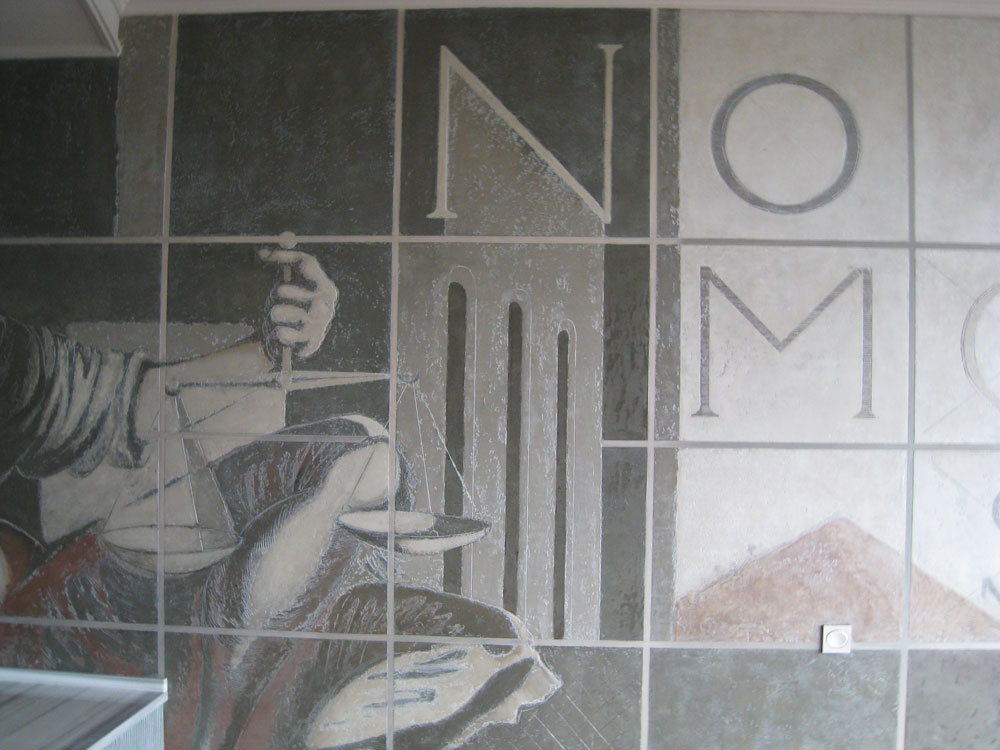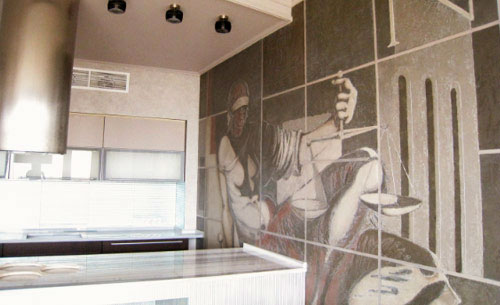 Композиция «Фемида» (тема была задана заказчиком изначально) выполнена в технике крашеного рельефа с серебрением. В ступенчато-считываемых буквах заключено понятие «стены закона» (номоса), существовашего в политической структуре греческого полиса. Реальная стена длиной 7 метров, своей материальностью и кирпичным строем замыкает объединенной пространство кухни и гостинной.