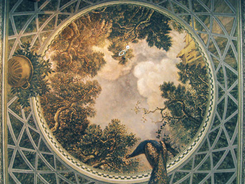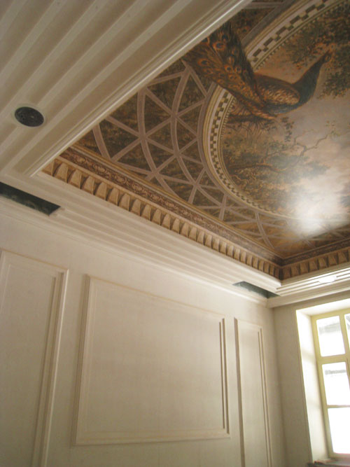 Хорошо, когда заказчик знает чего он хочет до того, как мы приступаем к работе. Это значительно упрощает задачу. Тема голландской живописи 17 века была таким условием. Данная роспись потолка относится к категории иллюзорной интерьерной живописи. Большая высота стен (420 см) позволила использовать форсаж тона, а сочетание традиционной пейзажной темы и современного элемента конструкции — сетки, придало росписи фантастический оттенок.